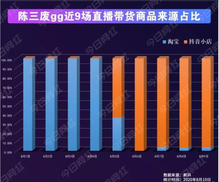 抖音带货达人陈三废gg,从8月5日开始,直播间商品来源的占比发生了两级反转般的变化——
