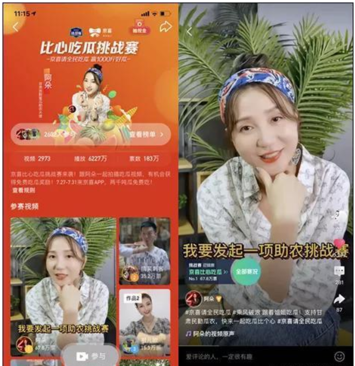 相比之下,阿朵姐姐则是走的“美食风”,一边吃瓜、一边卡点比心,腾讯微视联合京喜发起比心吃瓜挑战赛,吸引了众多达人和网友的积极参与。