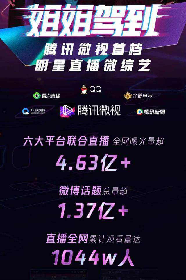 据官方公布数据显示,《姐姐驾到》六大平台联合直播的全网曝光量已超过4.63亿,微博话题总量超1.37亿,直播全网累计观看人数达到1044万。