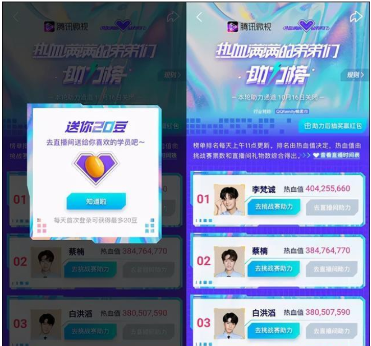9月28日,腾讯微视发起全网首档竖屏直播挑战赛《热血满满的弟弟们》,通过短视频海选,召集20名颜值和才艺兼具的弟弟们同台比拼,由张碧晨、汪东城、王霏霏、王菊、乃万等多位明星出任导师,旨在选出既具备唱跳专业能力、又能玩转直播短视频的练习生。