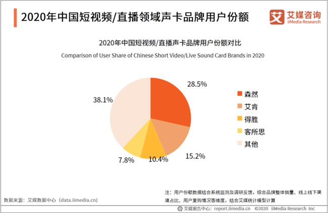 报告指出,2020年中国短视频直播声卡品牌用户份额中,森然以28.5%份额夺冠,艾肯、得胜分别列二三名。
