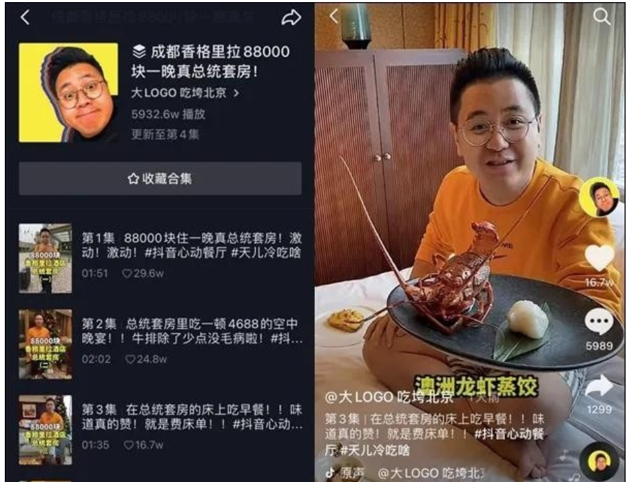 每个视频都相同的橙色上衣,夏冬的唯一区别只在于T恤还是卫衣,高高竖起的大背头,带着圆框眼睛,同一个双肩包和行李箱随时出发,在大Logo的视频里,你可以吃248元一口的和牛烤肉吃到爽,也可以在超市中的劳斯莱斯里畅买。