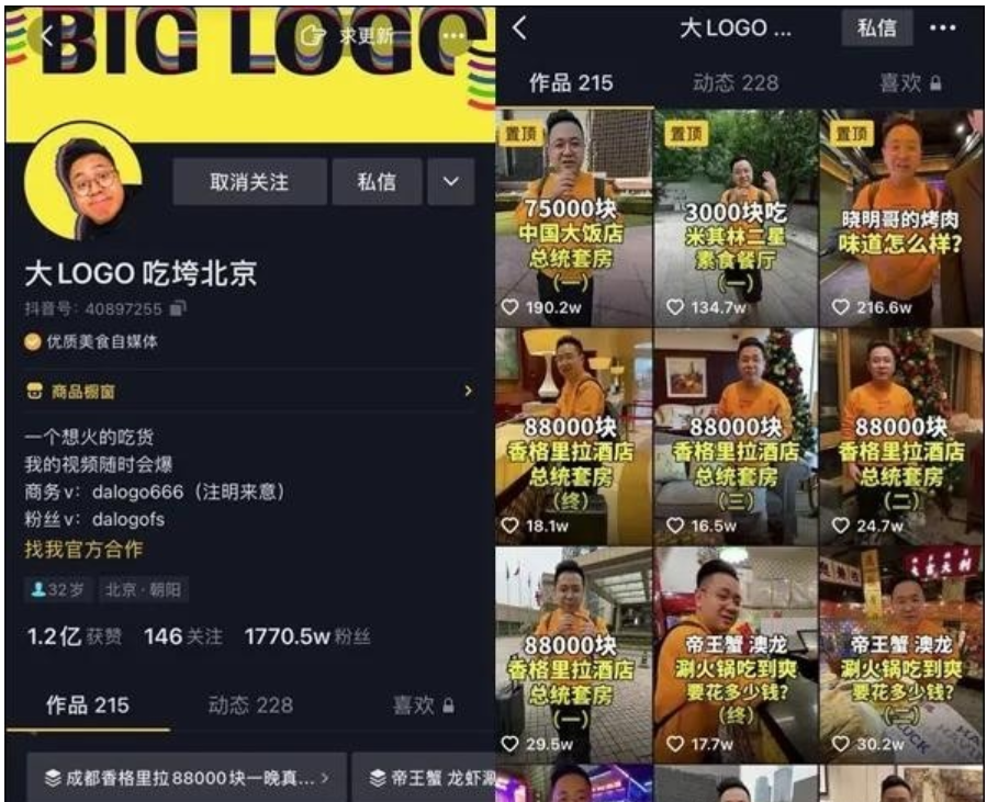 在大胃王美食账号被全网喊停后,美食探店类视频再迎来重新创作的高潮。近日,抖音上一个“有钱”美食探店账号“大LOGO吃垮北京”火了。