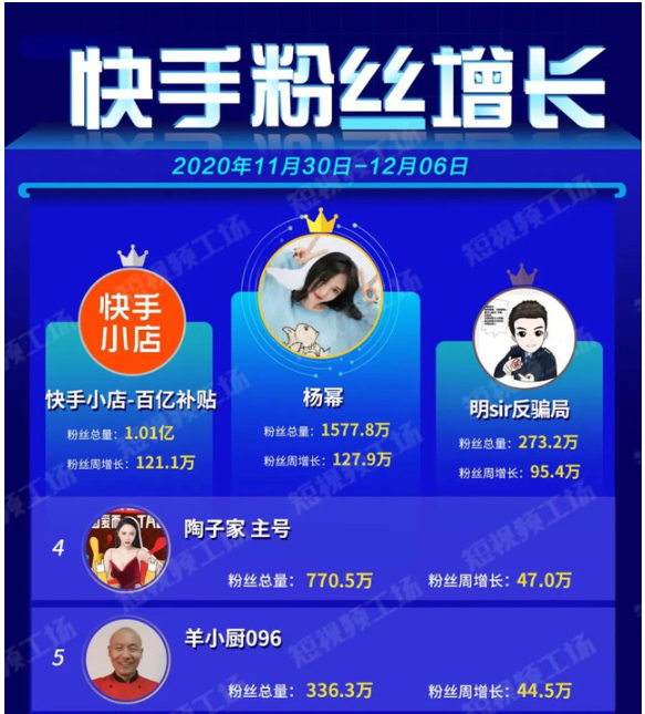 其中,明星账号“杨幂”本周继续拿下榜单第一,涨粉127.9万。上周榜一“快手小店-百亿补贴”本期涨粉榜121.1万,排名第二,目前粉丝总量达1.01亿。