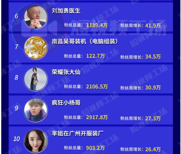 账号“刘加勇医生”继续上榜,单周涨粉41.9万,目前总粉丝数为1189.4万。该账号主角从医25年,在快手发布一些急救科普知识。