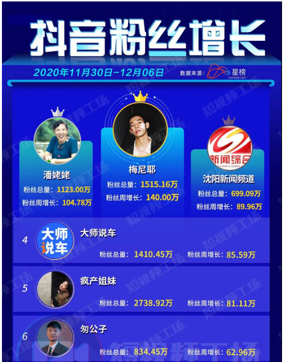 榜单数据上,涨粉方面,快手最高涨粉账号为“杨幂”,上周涨粉127.9万;“梅尼耶”单周涨粉140万,拿下抖音涨粉第一。