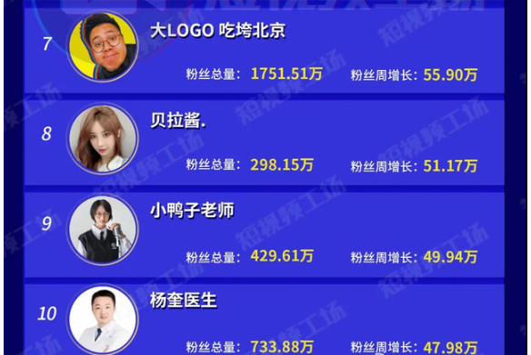 音乐达人“小鸭子老师”上榜,涨粉49.94万。换装达人“贝拉酱.”凭借高颜值、多样换装风格涨粉51.17万。医学账号“杨奎医生”分享有用靠谱的生活健康知识,并科普医学常识,帮助网友解决疑惑。