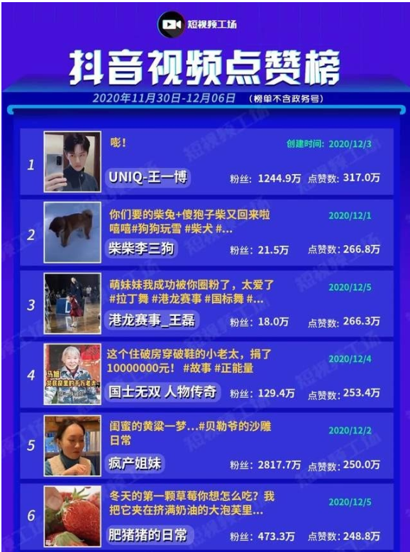 本周上榜视频点赞均在200万以上,这一期只有1个明星视频上榜,是“UNIQ-王一博”发布的视频。