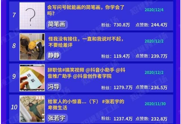 另一记录日常生活的VLOG账号“张若宇”也上榜,视频点赞在为232.7万。视频中,张若宇记录父母重拍婚纱照的情况,搞笑又温情。