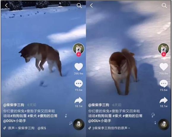 榜单第二是由“柴柴李三狗”发布的《你们要的柴兔+傻狍子柴又回来啦嘻嘻#狗狗玩雪 #柴犬 #傻狗的日常 》,点赞量266.7万。视频中,伴随着“草原最美的花,火红的萨日朗……”的歌声,狗狗像兔子一样在雪地里跳来跳去。