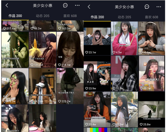 2年过去,我们看到美少女小惠这个账号已发布了200个作品,很长一段时间单个视频的获赞量再也不过百万,多个视频点赞数在10—30万之间,对于小惠这种千万粉丝级别的账号来说,视频反响确实一般。