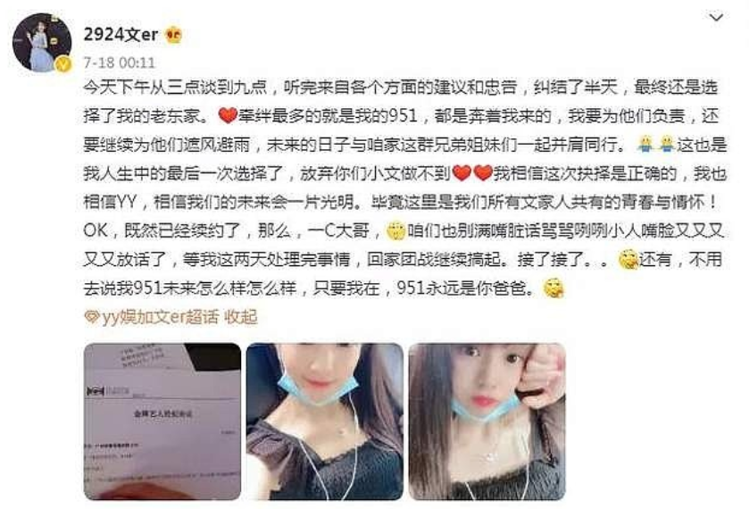 但也有平台和公会成功留住主播的案例。例如YY在7月份就和平台上的头部主播文er完成续约。