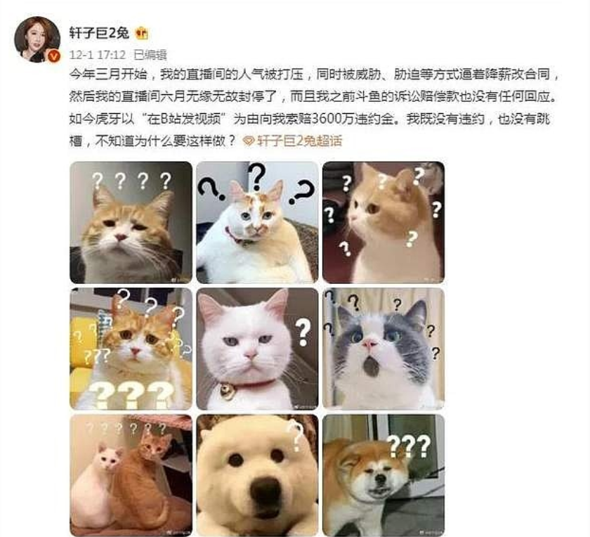 综合多个消息来看,事件的起因就是几个月前平台要与轩子巨2兔低价续约,但遭到拒绝,随后就出现了她在微博中提到了的一系列事件。
